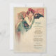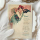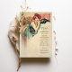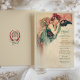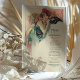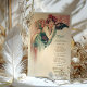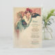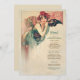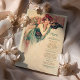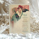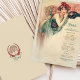 La carta de este boda con mucho encanto se caracteriza por el magnífico ilustracion Art Nouveau de una mujer de época adornada con una corona floral y vestido con un elegante vestido verde. La obra de arte es un reflejo perfecto del diseño de principios del siglo XX, con detalles intrincados y líneas fluidas que evocan un sentido de gracia y sofisticación. Los tonos cálidos de un suave rubor, el verde sabio y el rojo floral, combinados con elementos delicadamente estilizados, hacen de este menú una elección ideal para un boda vintage o de inspiración natural. En la parte trasera de la carta se sigue la temática Art Nouveau con un emblema botánico sencillo pero elegante, de color rojo y verde tierra, con un fondo crema. Este menú añade un toque de elegancia clásica y de arte romántico a la recepción de tu boda, ofreciendo tanto estilo como función.
