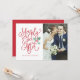 Difunde el amor mientras muestras tus fotos de boda esta temporada navideña con esta tarjeta de foto navideña de recién casados chic y moderna. Perfecta para que la pareja recién casada la use como tarjeta de Navidad, anuncio de boda o tarjeta de agradecimiento durante la temporada navideña. Esta tarjeta destaca tu foto de boda al combinarla con tipografía de guión festiva y juguetona en rojo que dice "Merrily Ever After" y acentuada por nuestro acebo de acuarela pintado a mano. En la parte posterior, agrega tu propio mensaje personalizado y 3 fotos adicionales.