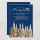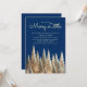 El diseño tiene el tema de una ducha de bebé "Merry Little Baby Shower", Marina Blue y Golden con árboles de Navidad y bosque de escarcha.