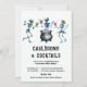 Una divertida, divertida pero elegante y moderna invitación a la fiesta de Halloween con un tema de calderos y cócteles, con tres esqueletos bailarines con cócteles parados alrededor del caldero de una bruja. Divertido y divertido, elegante, moderno, sencillo y elegante, para la mejor fiesta de Halloween que tu oficina haya visto.
