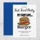 Invitación de fiesta de comida rápida de hamburguesa de mi primer amor diseñada por Nisha Prabhu. Con una deliciosa ilustración digital gráfica de hamburguesa con tipografía divertida ''Mi primer amor...Hamburguesa''. Totalmente personalizable. Personaliza con tus detalles. ¡Prepárate para deleitarte y celebrar tu amor por las hamburguesas con estas invitaciones de fiesta de comida rápida de hamburguesa de primer amor! Perfectas para organizar una fiesta temática de hamburguesas o una reunión informal con amigos, estas invitaciones seguro que abrirán el apetito y pondrán el tono para un evento lleno de diversión. Con un diseño divertido que rinde homenaje a la comida reconfortante favorita de todos, estas invitaciones harán que tus invitados cuenten los minutos hasta que puedan hincarle el diente a deliciosas hamburguesas. ¡Haz que tu fiesta
