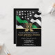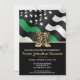 This design features a military flag with black and white stripes, and a thin green line stripe as well. The army boots and gold text sits above all of the party details for the graduating sergeant, captain, soldier, lieutenant or general's graduation party details.
