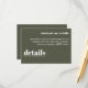 Mantén tu papelería boda elegante y sencilla con esta invitación a detalles mínimos del Boda. Con un diseño limpio y moderno con tipografía atemporal, esta tarjeta es perfecta para compartir toda la información importante sobre su gran día. Su diseño minimalista garantiza que tus detalles permanezcan en el centro de atención y complementen cualquier estilo boda. Ideal para parejas que aprecian la elegancia y la estética contemporánea.