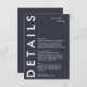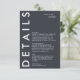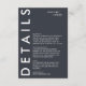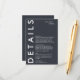 Mantén tu papelería boda elegante y sencilla con esta invitación a detalles mínimos del Boda. Con un diseño limpio y moderno con tipografía atemporal, esta tarjeta es perfecta para compartir toda la información importante sobre su gran día. Su diseño minimalista garantiza que tus detalles permanezcan en el centro de atención y complementen cualquier estilo boda. Ideal para parejas que aprecian la elegancia y la estética contemporánea.