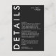 Mantén tu papelería boda elegante y sencilla con esta invitación a detalles mínimos del Boda. Con un diseño limpio y moderno con tipografía atemporal, esta tarjeta es perfecta para compartir toda la información importante sobre su gran día. Su diseño minimalista garantiza que tus detalles permanezcan en el centro de atención y complementen cualquier estilo boda. Ideal para parejas que aprecian la elegancia y la estética contemporánea.