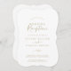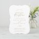 Esta invitación de recepción de boda de oro con hoja minimalista es perfecta para una elegante fiesta después de la fuga. El diseño presenta una simple silueta de vegetación en lámina de oro falso con un estilo minimalista clásico. Las tarjetas de RSVP se venden por separado, o puede agregar información de RSVP al dorso de la tarjeta.