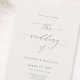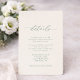 This elegant wedding details card features a refined minimalist design with soft sage green typography on a warm ivory background. Clean layout and graceful script headings create a timeless look that pairs beautifully with modern, classic, and garden-style weddings.