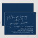 Esta es la tarjeta de invitación de la fiesta de boda fuga, con diseño de letra Azul Marino minimalista (Nada elegante, solo amor).