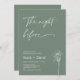 Simple rehearsal dinner invitation featuring an sage green background, a white modern calligraphy heading and line floral illustration. Ideal for someone looking for a minimalist sage green rehearsal dinner invitation.