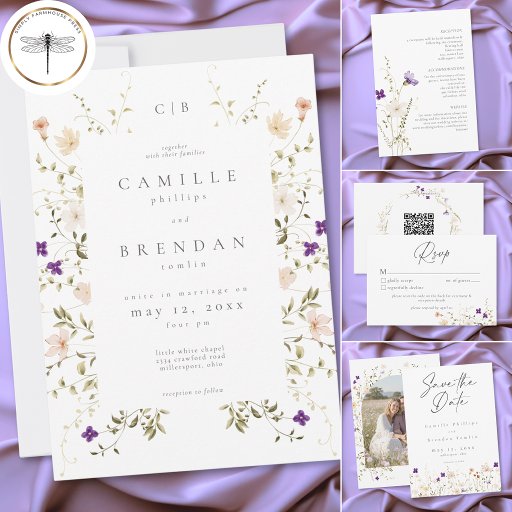 This minimalist wildflower romantic botanical wedding invitation design features delicate florals, soft neutral tones, and elegant typography. Perfect for couples seeking a timeless, romantic style, it offers a refined, modern look that elevates your wedding aesthetic. Created by Simply Farmhouse Press.