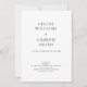 La invitación a la boda presenta un diseño minimalista y elegante con un fondo blanco y limpio. El texto está organizado en un diseño centrado con una fuente serif clásica para los nombres principales y una fuente sans-serif para los detalles más pequeños. Los nombres de la pareja se muestran de forma destacada en letras mayúsculas, lo que crea un punto focal sorprendente. A continuación, el texto adicional está alineado de forma clara, proporcionando detalles del evento en un estilo sencillo y moderno. El espaciado y la alineación sutiles le dan al diseño un toque ventilado y sofisticado, complementado con el uso de la tipografía negra para una paleta monocroma intemporal.