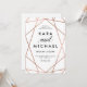Esta elegante invitación a la boda presenta un diseño geométrico y dorado falso en rosa sobre un fondo blanco nítido.