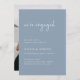 Estas elegantes y polvorientas invitaciones azules y blancas a la fiesta de compromiso son sencillas y minimalistas, pero muy elegantes, gracias a la escritura moderna escrita a mano que dice "estamos comprometidos", y al diseño limpio. Tu foto personal favorita va al fondo.