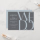 Las invitaciones a bodas simples pero audaces de 7" x 5" incluyen las palabras "Lo hacemos", en letras azules polvorientas y sobredimensionadas sobre un fondo gris oscuro con un texto editable en azul claro y gris para los nombres de la pareja boda, fecha, hora, lugar, dirección del lugar con el mensaje al final, "recepción a seguir".