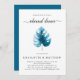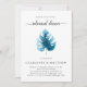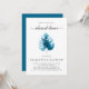 Diseño de invitaciones a la cena de ensayo tropical con ilustracion de hojas de monstera color agua sobre un sencillo fondo blanco. El lado inverso de la invitación está en un color azul profundo.