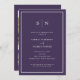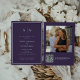 Estas elegantes y modernas invitaciones a participar en fiestas cuentan con un colorido diseño de texto minimalista morado y blanco, con un marco clásico en el borde. Añada sus iniciales o su monograma para hacerlas completamente propias. La parte posterior de la invitación incluye su foto personal favorita, además de un código QR escaneado.