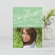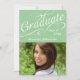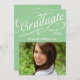 Texto blanco y rápido de escritura, riéndose y curvando con "graduado", y una foto para anunciar el gran logro. Cursiva caprichosa y fantasiosa con la palabra Celebrar en la espalda. Copyright © www.CustomInvitesOnline.com