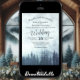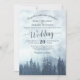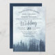 Esta hermosa invitación a la boda presenta un estilo rústico y elegante con caligrafía de escritura de encaje sobre un fondo acuático de abeto de montaña azul o pinos envueltos en niebla o niebla. Los colores son variados en tonos azules, lo que hace que esta invitación sea perfecta para una ceremonia al aire libre, salvaje o de invierno. En la parte trasera hay espacio para un código QR y una dirección web donde los huéspedes pueden obtener más información y RSVP.