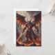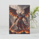 Esta cautivadora imagen muestra a una poderosa figura demoníaca en un apasionado paisaje. La figura cuenta con grandes alas tipo murciélago envueltas en llamas y vestida con armaduras oscuras. Sus ojos rojos resplandecientes y su expresión amenazante, con grandes cuernos curvos, le dan un toque formidable. Con una espada en llamas en la mano derecha, el demonio exuda poder, con su pecho resplandeciente como si estuviera alimentado por un fuego interno. El telón de fondo dramático de un cielo tormentoso, un rayo y edificios de estilo gótico realza la intensa y épica atmósfera de la escena, haciendo de esta obra una llamativa representación de una criatura mítica en un momento de dominio.