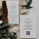 El borde izquierdo de esta elegante y moderna invitación a la boda incluye una pasarela de color marrón mocha bordeada por un falso purpurina de oro. El texto del personalizable combina la escritura a mano de carbón gris, el copperplate y las fuentes cursivas en un fondo blanco. El reverso proporciona espacio para los detalles del boda sobre un fondo blanco sólido, junto con un código QR que los huéspedes pueden explorar para visitar su sitio web y RSVP, lo que ahorra el coste de imprimir y enviar por correo tarjetas RSVP separadas.