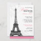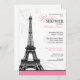 Invitaciones rosas: Elegantes y modernas invitaciones a la ducha de novias parisinas con una Torre Eiffel a escala gris sobre un borde rosa inferior con flores de gris claro detrás.