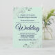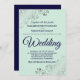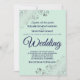 Esta sencilla pero elegante invitación a la boda incluye letras de escritura azul marino en un fondo verde pálido o de color neonormenta. El diseño es sobrio, pero en las esquinas hay un florido Relieve metalizado plateado ornamentado con rizos y adornos. El texto es formal y tradicional, pero el diseño de la moda hace que esta invitación sea apropiada para cualquier boda.