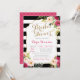 Invitación a rayas de Moda adornada con hermosas flores acuáticas y texto purpurina dorado para una ducha nupcial