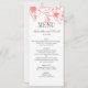 Elegante y romántico estilo magnolia boda diseño de cartas de menú para la cena en tonos grises de coral y agua caliente.