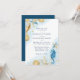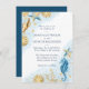 Sofisticada colección de bodas de color azul y dorado con una acuarela "sol, arena y mar". El diseño se compone de conchas de concha, pez estrella, un caballito de mar y arrecife de coral que complementan los tonos azules, dorados y blanquecinos con un toque de azul que le da un efecto acuático. Los detalles de su evento en letras modernas de color azul marino están enmarcados en el borde acuático acuático de elegantes corales marinos, conchas y estrellas de mar.