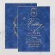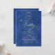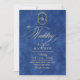 Elegante y elegante invitación de boda moderna en azul y oro con un elegante tipo de letra manuscrita con rizos y un monograma de la novia y el novio. Una invitación elegante, sencilla y moderna.