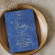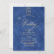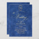 Elegante y elegante invitación de boda moderna en azul y oro con un elegante tipo de letra manuscrita con rizos y un monograma de la novia y el novio. Una invitación elegante, sencilla y moderna.