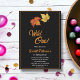 Esta elegante invitación al cumpleaños de otoño es perfecta para un cumpleaños de otoño moderno. El diseño sencillo presenta hojas de arce de otoño con una tipografía blanca y naranja elegante sobre un fondo negro.