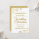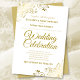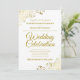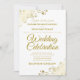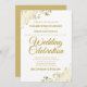 Esta hermosa invitación a la boda es elegante, sencilla y elegante. En cada esquina se pueden ver grabados con guion dorado en un fondo blanco con un fondo floral de imitación de Relieve metalizado. El diseño sobrio queda compensado por los adornos de las obras de arte.