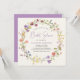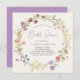 Una elegante invitación a la ducha de novia con crema clara, que incluye "Bridal Shower", mostrada en un guion de moda violeta, y una corona de colores violeta, rosa, melocotón y amarillo con flores silvestres. Personalice el nombre de la novia y los detalles de la ducha con letras simples en color púrpura y gris.