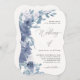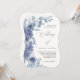 Elegante caligrafía con delicadas flores de color azul acuático y follaje en color crema invitación a la boda.