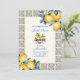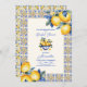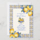 Invitación a la ducha de novia con tema limón, con ilustraciones acuáticos de limones, flores de limón y tejas mediterráneas. Personalice agregando nombres, fecha, hora y otros detalles. Esta ducha con limón de novia es perfecta para bodas de verano y duchas de novias temáticas mediterráneas.