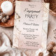 Una romántica invitación a una fiesta de compromiso con los agitadores florales de oro rosa sobre una rosa rosa rubor con fondo de mármol con brillantes de luz festiva.
