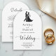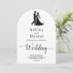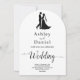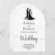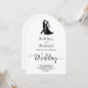 Esta elegante invitación a la boda en arco blanco y negro es perfecta para un boda moderno. El diseño es sencillo y cuenta con una elegante caligrafía negra y un ilustracion de novios sobre un fondo blanco y limpio. La tarjeta de invitación incluye los detalles del boda en la parte posterior en lugar de pagar por una tarjeta separada.