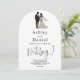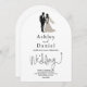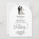 Esta elegante invitación a la boda en arco blanco y negro es perfecta para un boda moderno. El diseño es sencillo y cuenta con una elegante caligrafía negra y un ilustracion de novios sobre un fondo blanco y limpio. La tarjeta de invitación incluye los detalles del boda en la parte posterior en lugar de pagar por una tarjeta separada.