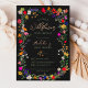 ¡Una flor silvestre en camino! Añada un toque de elegancia bohemia a su ducha de bebé con nuestra Moda moderna Boho Bright Elegant Colorful wild flowers Invitación. Flores botánicas de tonos rosa, rojo, verde y morado inspiradas en flores silvestres y jardines rústicos acuarelas con vegetación sutil y tipografía moderna de escritura boho sobre fondo negro.