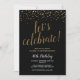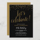Perfecto para un cumpleaños próximo, esta invitación se puede personalizar para cualquier edad. En un fondo negro, hay pequeños corazones de purpurinas de oro en la cima, debajo de la elegante tipografía de escritura de oro que dice "¡celebremos!". Debajo, en una mezcla de tipografía blanca y dorada, puedes personalizar fácilmente con tu nombre, detalles fiestas y la edad que se celebra. El fondo de la invitación tiene un fondo dorado.