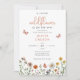 Moda moderna Una pequeña invitación a la Baby Shower con flores silvestres en flor silvestre, con flores, mariposas y hojas dibujadas a mano y fondo rosa melocotón en la parte posterior.
