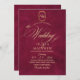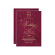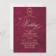 Elegante y elegante invitación a bodas modernas en rojo y oro con un elegante tipo de letra manuscrita con rizos y un monograma de la novia y el novio. Una invitación elegante, sencilla y moderna.