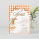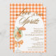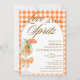Moda Rústica y Elegante Amor en la Primera Invitación de Spritz Bridal Shower - Con una acuarela Aperol spritz con un naranja de ajo, adornado con una coqueta arco naranja. La invitación tiene un fondo rústico, de color gingham plateado naranja y un armazón. Las palabras "Amor en el primer Spritz" están escritas en una mezcla de caligrafía de escritura refinada y texto marrón de bloques elegantes. Edite esta plantilla de invitación a ducha de novia con sus propios detalles de evento. También disponible como descarga digital instantánea, enviar fácilmente por mensaje de texto, correo electrónico o medios sociales.