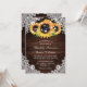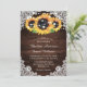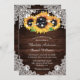 Invitaciones caseras de girasol rústicas personalizados, ideales para una fiesta rústica de campo, patio trasero o bodas de granero inspiradas en flores de girasol. Los objetos de juego completan estas invitaciones florales rústicas a bodas con girasoles sobre un fondo rústico de madera adornado con encajes florales blancos y luces de cuerdas.