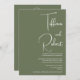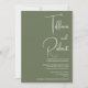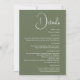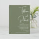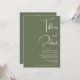 Invite a sus huéspedes con estilo con la invitación a la Boda Verde de la Moda. Con un suave fondo verde sabio y una elegante redacción en blanco, esta invitación combina simplicidad con sofisticación. La parte delantera muestra los nombres de la pareja, la fecha de boda y el lugar, mientras que la parte trasera proporciona detalles adicionales del boda, creando un diseño sin fisuras y organizado. Perfecto para bodas modernos, rústicos o de inspiración natural, esta invitación le aporta un toque de elegancia natural a su día especial.