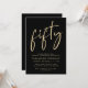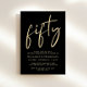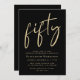 Invitación negra de moda para tu fiesta de cumpleaños número 50 con "cincuenta" en un elegante guión de oro, tu nombre en una elegante tipografía de sables de oro y los detalles fiestas con letras de oro sencillas y modernas.