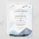 El diseño presenta hermosas montañas de pizarra azul y un bosque de coníferas al fondo. Una tarjeta perfecta para una boda de destino o amantes de la naturaleza. Hay más elementos coincidentes disponibles en la tienda.
