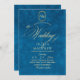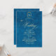 Elegante y elegante invitación turquesa y moderna de boda dorada con un elegante tipo de letra manuscrita con rizos y un monograma de la novia y el novio. Una invitación elegante, sencilla y moderna.