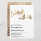 Para el encabezado de estas tarjetas en negrita, he utilizado una fuente manuscrita moderna y casual para crear una superposición de tipografía gráfica que dice "Celebra con nosotros". Esta imagen fue embellecida con un efecto de lámina dorada falsa suave para una vibra de celebración. Rellene los espacios en blanco del modelo con sus datos para personalizar el diseño. Todas las capas se dejaron desbloqueadas para que pueda hacer clic para personalizar aún más y reposicionar el texto o incluso cambiar el tamaño o las fuentes. El fondo estaba cubierto con un patrón retro repetitivo de inspiración marroquí que ha sido embellecido con el mismo efecto de oro falso. Otras tarjetas están disponibles en la serie que tienen diferentes frases de encabezado de tipografía dorada. Por favor, no dude en hacérselo saber para obtener ayuda con la personalización.